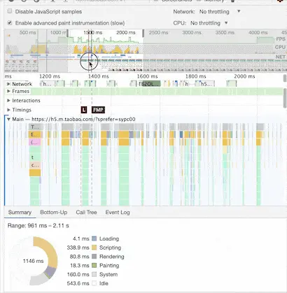 通过图片和 Performance 的 main 部分,我们可以看得出来淘宝移动端的加载方式,是一块一块去加载的,暂时我们称之为 模块化加载