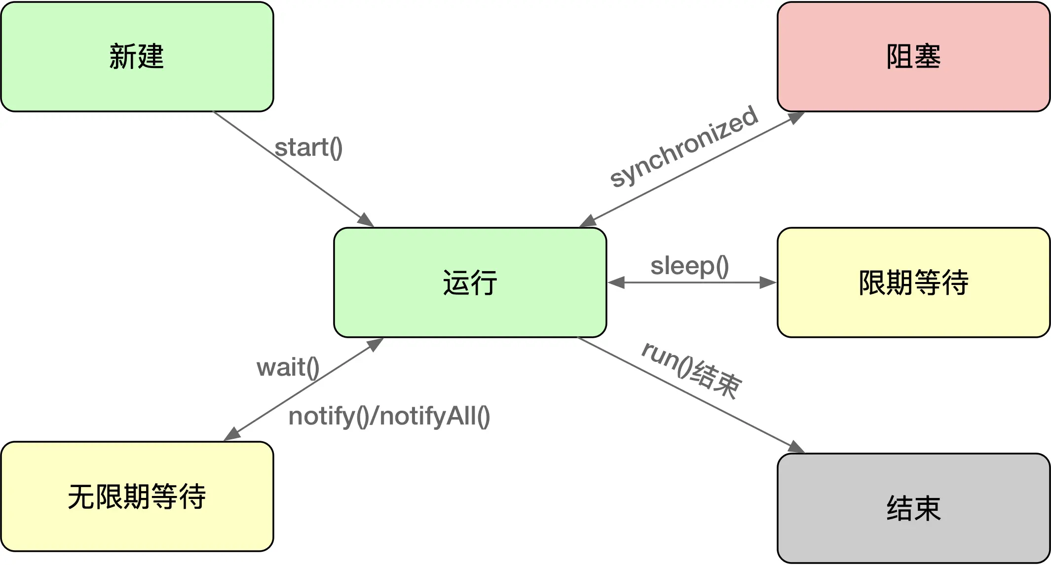 - 阻塞(Blocked):线程被阻塞了,「阻塞状态」和「等待状态」的区别是:「阻塞状态」在等待着获取一个排他锁,这个事件将在另一个线程放弃这个锁的时候发生;而「等待状态」则是在等待一段时间,或者唤醒动作的发送。在程序等待进入同步区域时,线程将进入这种状态;