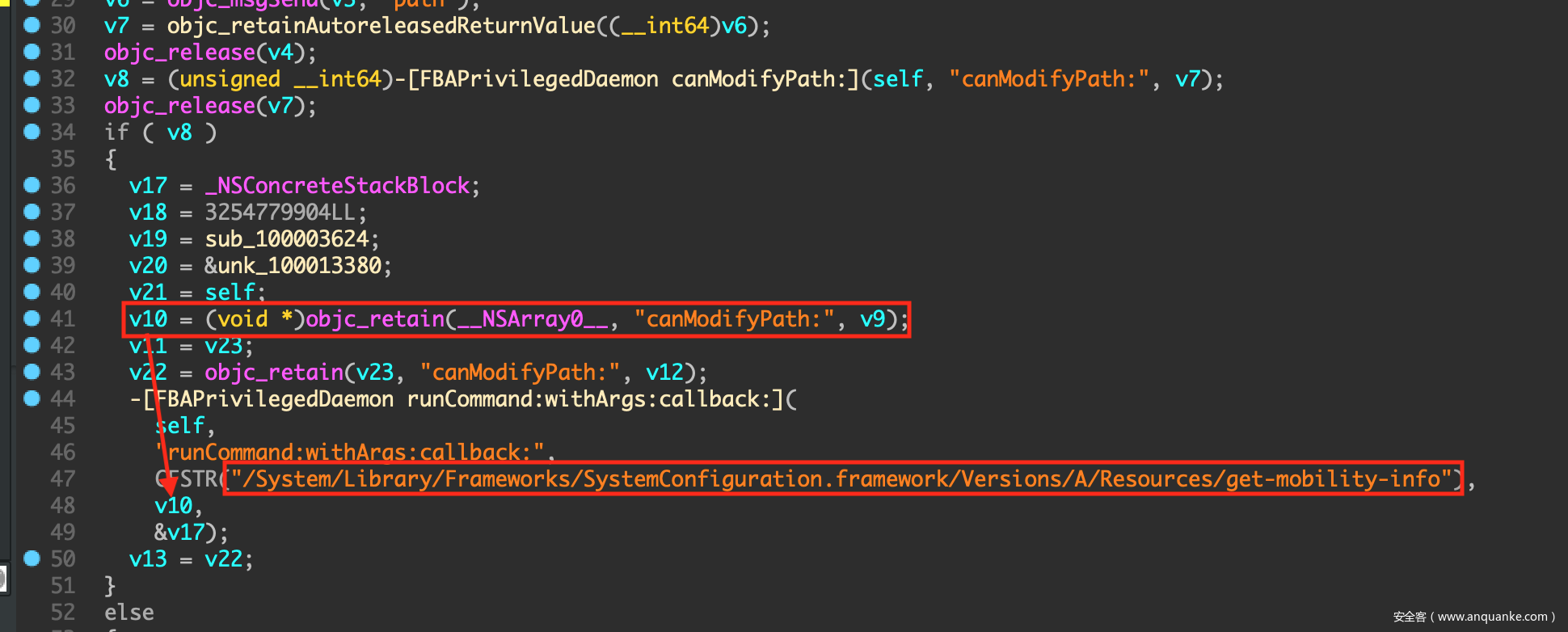 IDA中继续看到方法runMobilityReportWithDestination:,这里会调用/System/Library/Frameworks/SystemConfiguration.framework/Versions/A/Resources/get-mobility-info这个脚本。另外调用该方法需要一个路径参数,这个路径同样需要具有前缀/var/folders/、/private/var/或/tmp/