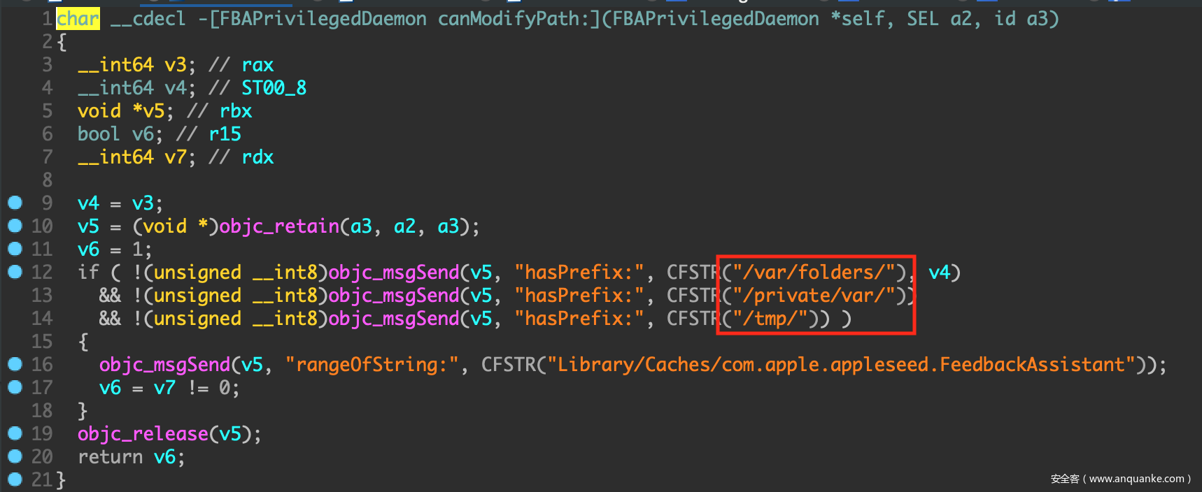 fbahelperd的检查后,调用copyLogFiles:方法将root.sh复制到/usr/local/bin/netdiagnose - 当绕过安全检查后,调用方法