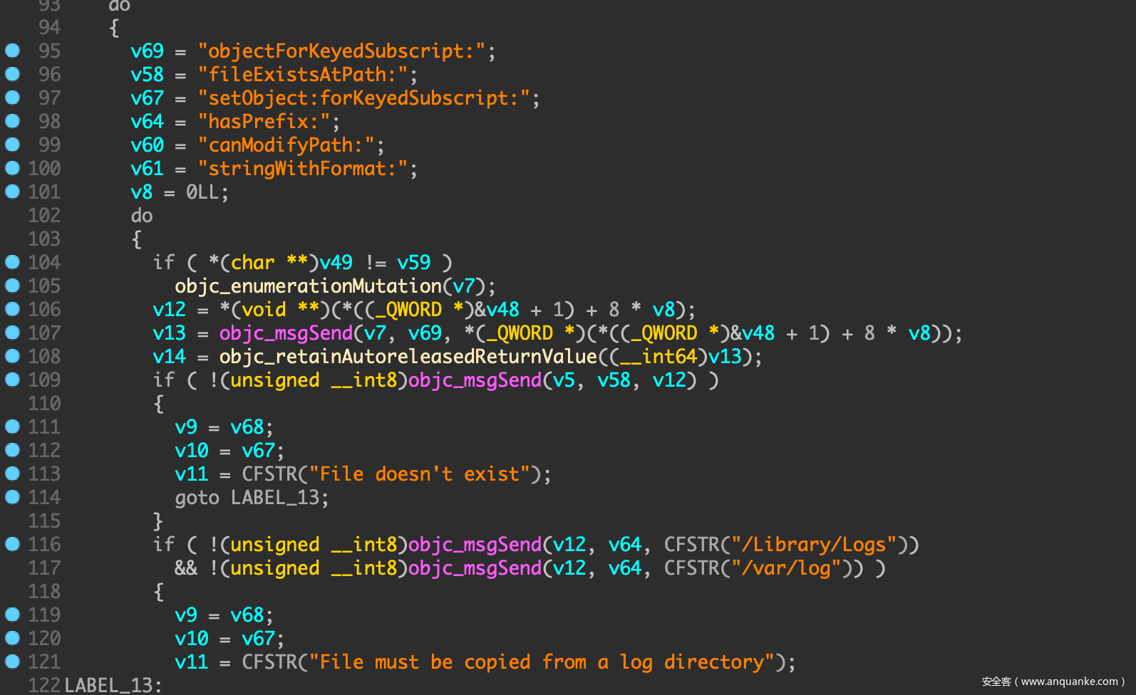 IDA继续分析fbahelperd,看到方法copyLogFiles,该方法接受一个NSDictionary参数,其key值是文件的源路径,value值则是目标路径,将源路径文件复制到目标路径