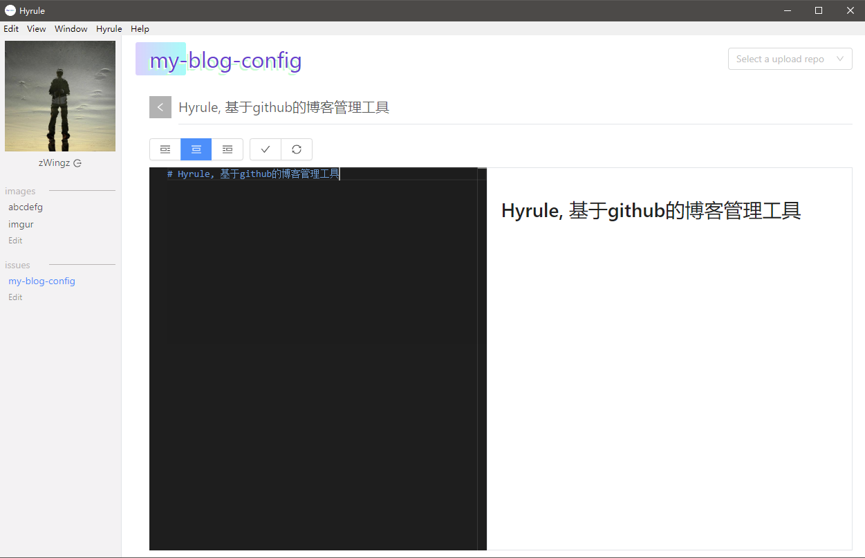 在Hyrul中,你可以先上传图片到图床,然后复制其markdown格式链接粘贴在文章中。也可以直接在编辑器中上传,它会自动上传到所选的图床中。(当然,前提是需要提供一个repo来做默认图床)