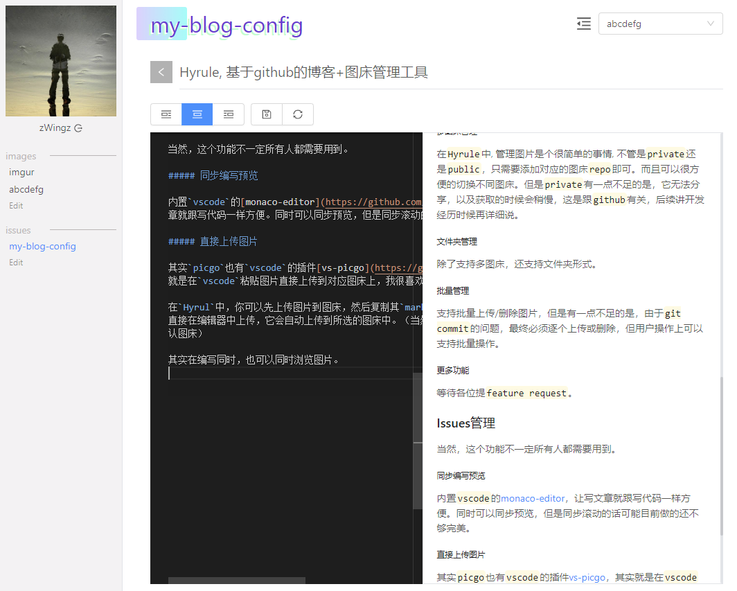内置vscode的monaco-editor,让写文章就跟写代码一样方便。同时可以同步预览,但是同步滚动的话可能目前做的还不够完美。