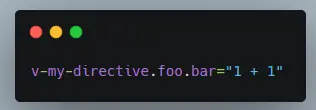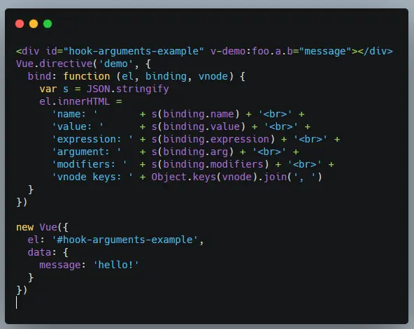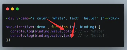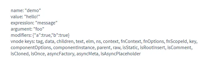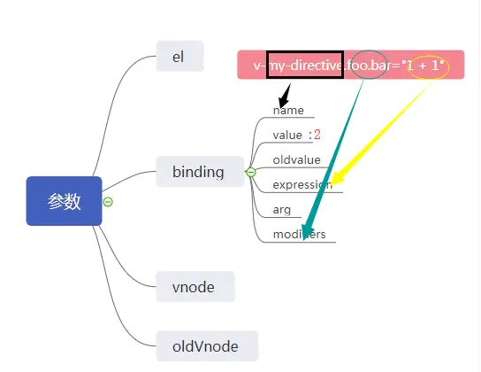 arg:foo&bar,参数可以是动态的,v-mydirective:[argument]="value"modifiers:{ foo: true, bar: true }oldValue:指令绑定的前一个值,仅在update和componentUpdated中可用。无论值是否改变都可用vnode:Vue编译生成的虚拟节点。oldVnode:上一个虚拟节点,仅在update和componentUpdated中可用。