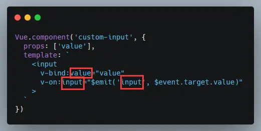 text和textarea元素使用value属性和input事件;checkbox和radio使用checked属性和change事件;select字段将value作为prop并将change作为事件。