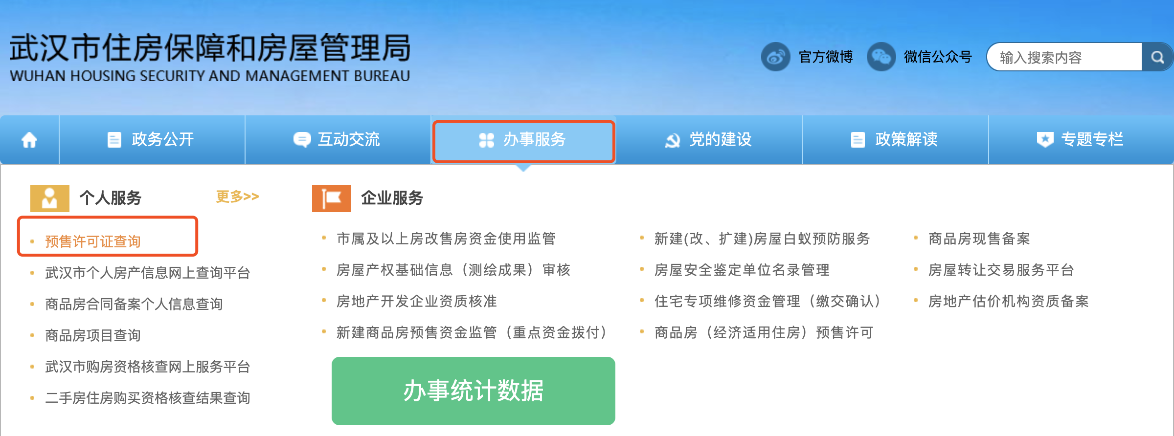 打开武汉市住房保障和房屋管理局官网,选择办事服务,选择预售许可证