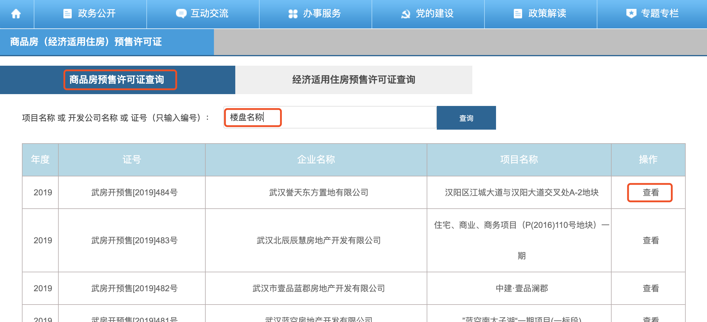 进来之后,默认是商品房许可证查询,输入楼盘名称,找到售楼部展示的 《商品房预售许可证》,点击查看