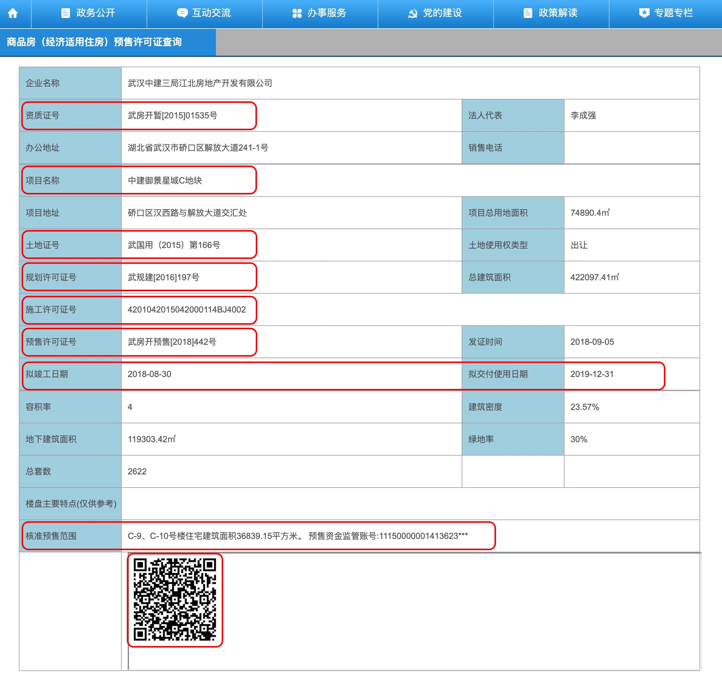 - 二维码:用手机浏览器扫一扫,可以查看 《开发企业资质证书》、《国有土地使用证》、《建设工程规划许可证》、《建筑工程施工许可证》、《商品房预售许可证》、《营业执照》,如下图