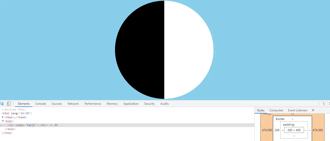 将盒子设置为 大小为200*400 px,背景色为白色,边框圆角为50%,另外一半黑色可以通过border-left:200px solid #000,这样就可以实现半黑半白的效果(盒子的实际大小为400*400 px)。