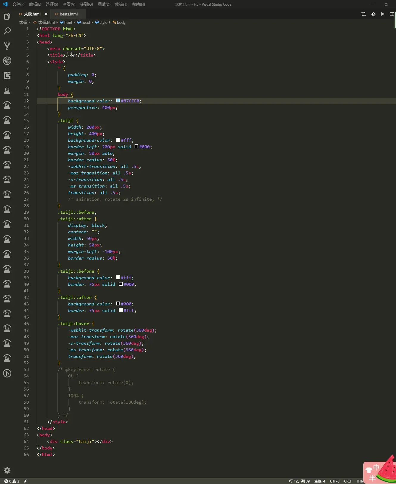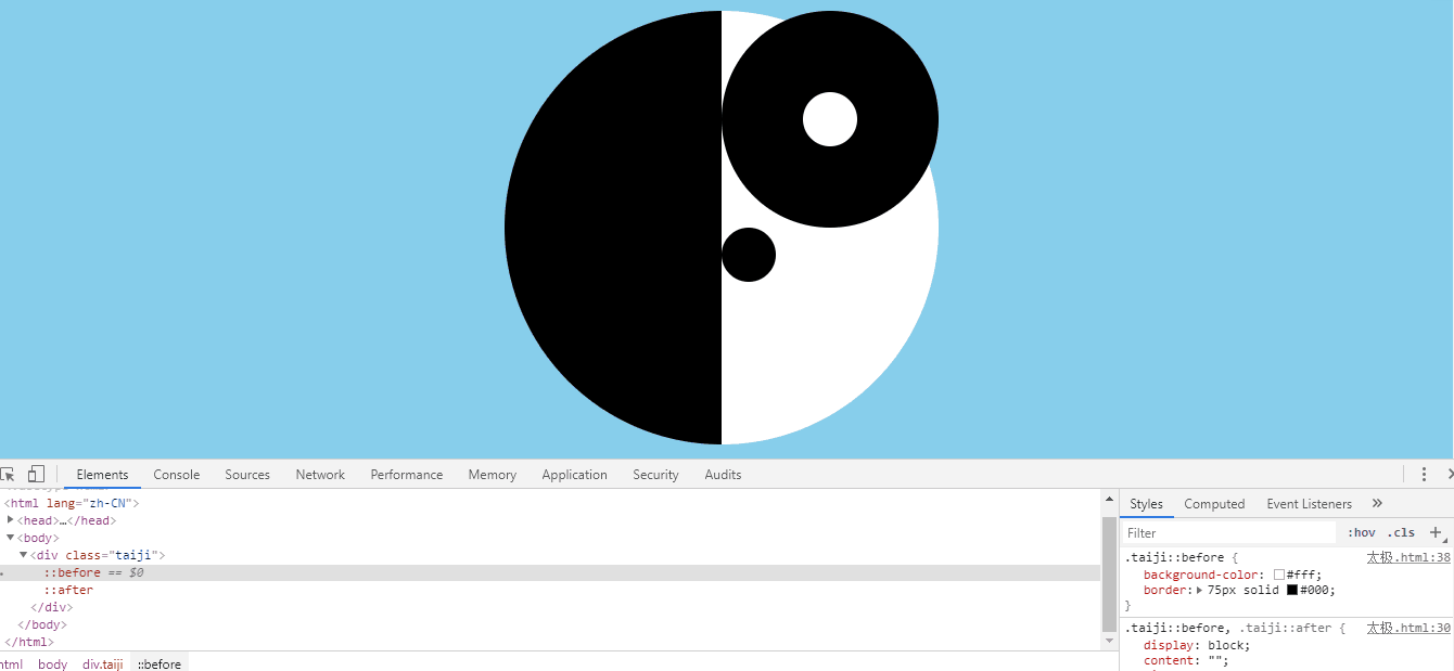 对于太极图的实现,很多前端小白的脑袋瓜子最先蹦出的是用几个盒子来实现,其实用一个div盒子通过C3就能实现太极图。