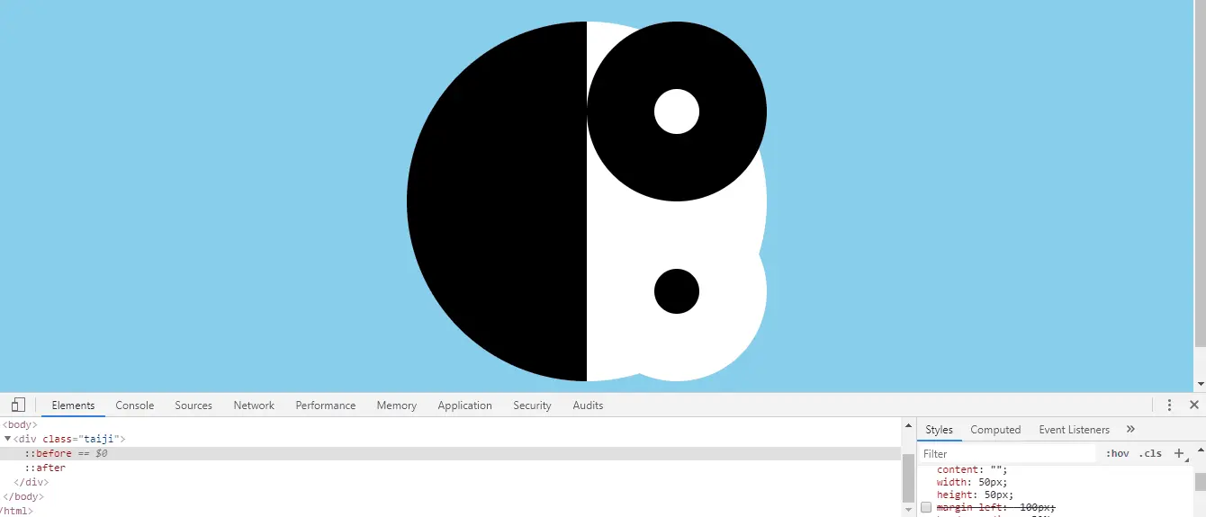 小圆在这里就可以用上伪元素啦。两个小圆的大小都为50*50 px,边框圆角为50%,margin-left:-100px;上小圆背景色为白色,border:75px solid #000,下小圆背景色和边框色则跟上小圆相反,背景色为黑色,border:75px solid #fff,这样就可以实现啦(小圆的实际大小为200*200 px)。