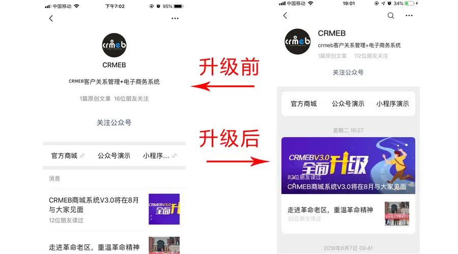 这次微信更新虽然算不上一次大的更新,但是整体还是很不错的,整体使用也很流畅,用户体验也考虑的很好,期待这款国民软件越做越好!CRMEB借助微信平台服务更多的人。