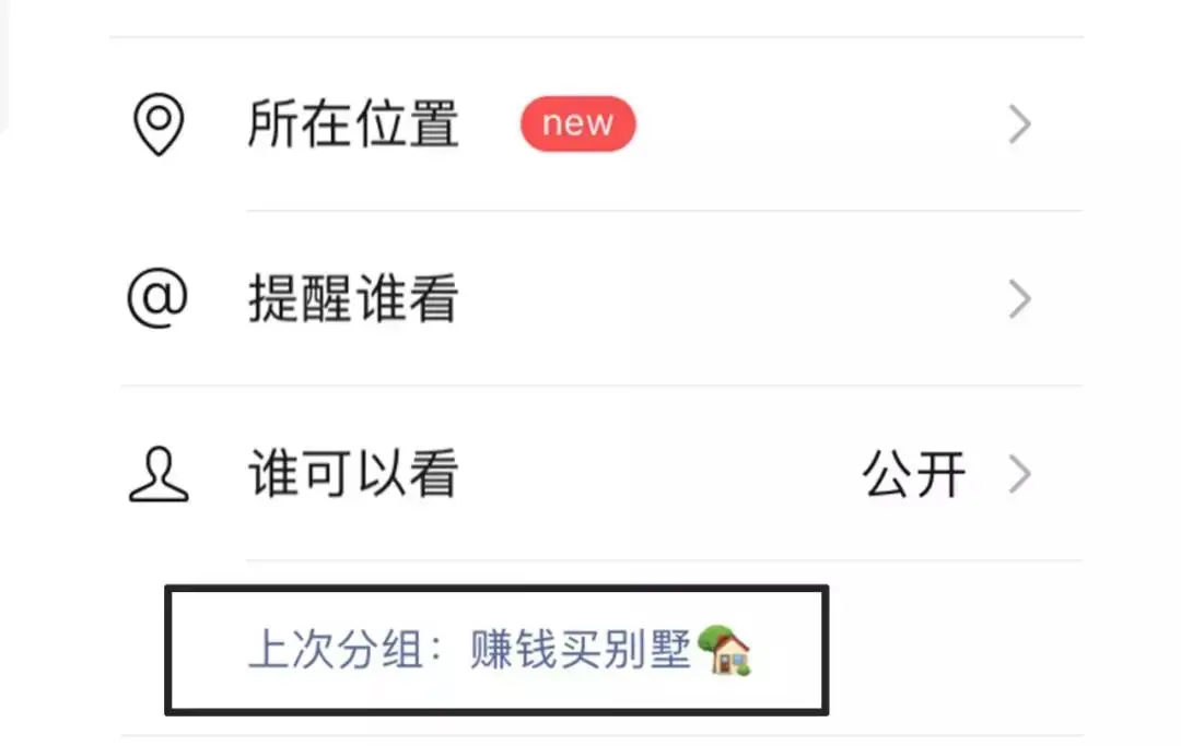升级后的版本,只要发一次屏蔽分组的朋友圈,第二次发送系统就会自动提示你:选择上次分组屏蔽/可见。以后发朋友圈想屏蔽部分好友不可见就没那么麻烦了。