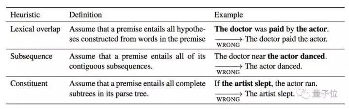 这篇论文里BERT是在多类型语言推理数据集 (MNLI) 上训练的,而测试集则是研究团队自制的HANS数据集: