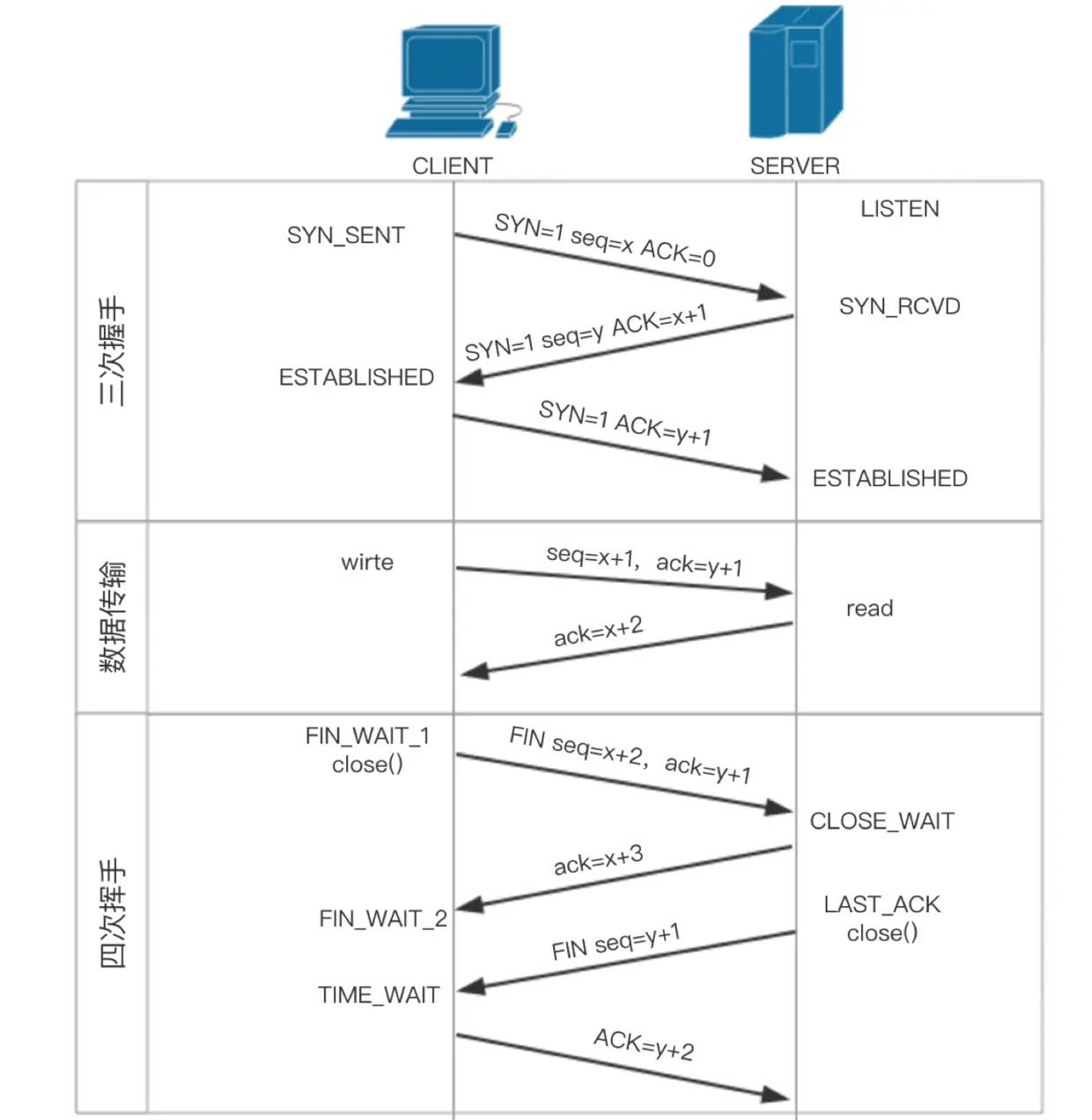 client发送syn=1(SYN = 1 表示这是一个连接请求或连接接受报文),seq为随机数x的数据包到server。Client进入syn_sent状态。