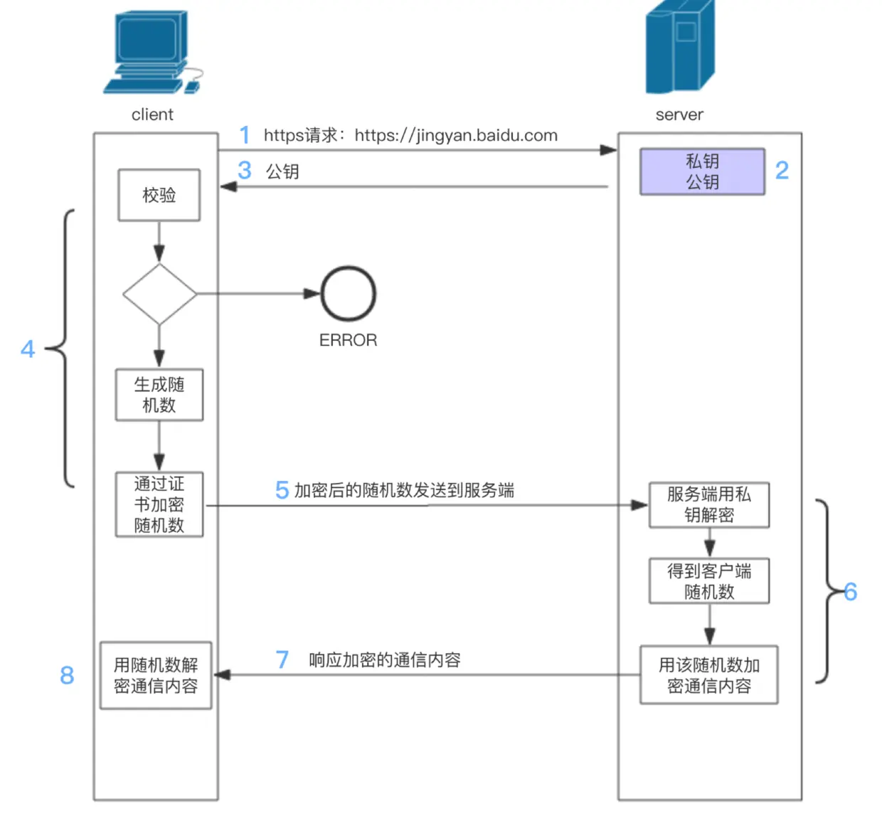 4、如果校验通过,客户端生成随机数,该随机数可以认为是客户端私钥匙,并用服务端返回的证书对该随机数加密。该加密过程是对称加密,目的是服务端能够解密内容。