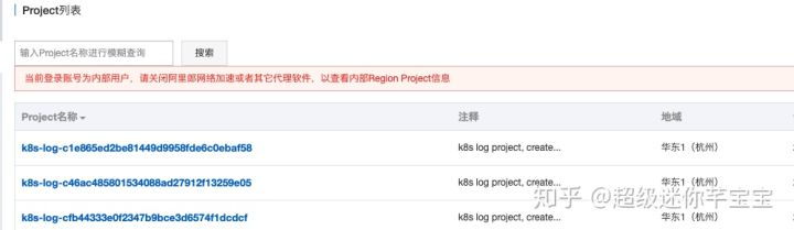 集群安装完毕后,可以在日志服务控制台 查看到按k8s-log-{Kubernetes 集群 ID}形式命名的工程。收集到的业务容器日志都会放在该工程下。