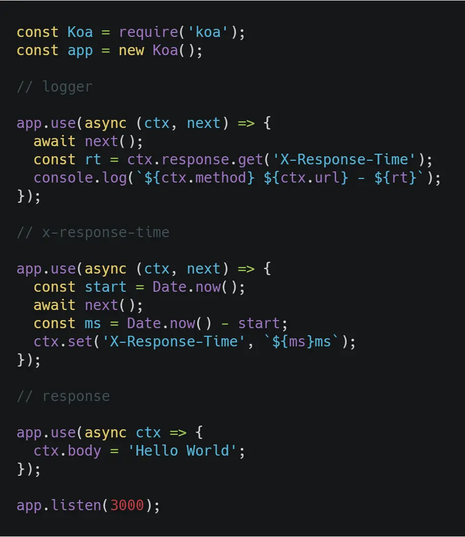 也就不难理解为什么我们 await next()。 的时候等待的是后面所有中间件串联执行后了,回头再看下上文中间件部分的执行顺序就豁然开朗了。