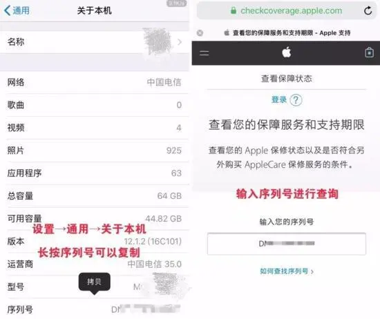 iPhone 或其他苹果设备,可以通过官方查看保障状态页面,在线查看激活日期,由此判断新设备是否被提前激活。苹果官方保修服务查询页面 首先,打开手机设置 → 通用 → 关于本机,长按序列号,拷贝备用。然后,在Safari浏览器打开苹果官方保修服务查询页面,填入序列号进行查询。