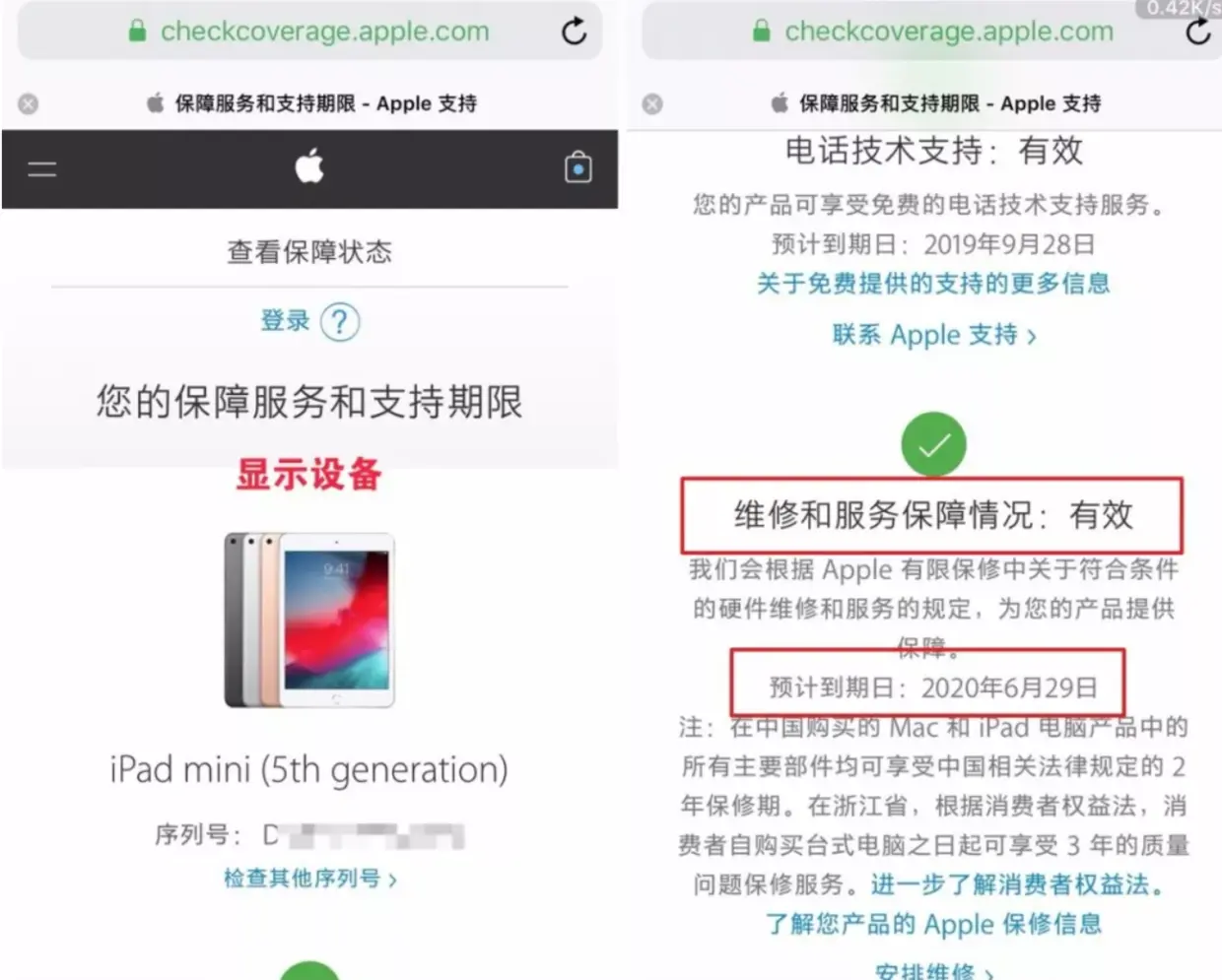 设备名称,购买日期是否有效,电话技术支持是否有效。最重要的是维修和服务保障情况,会显示你的保修日期,这个日期往前一年,就是你设备的激活日期。 - 示例图片保修日期是