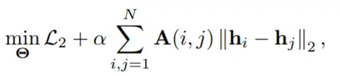 结构化深度网络嵌入(SDNE)[76] 通过表明,方程式 35 中的 L2 重建损失实际上对应于二阶邻近度,填补了这个难题。即如果它们具有相似的邻域,则两个节点共享相似的嵌入表示,这在网络科学中进行了很好的研究,例如协同过滤或三角闭包[5]。 由网络嵌入方法启发,表明一阶邻近也很重要 [86],SDNE 通过添加另一个类似于拉普拉斯特征映射的项来修改目标函数[54]: