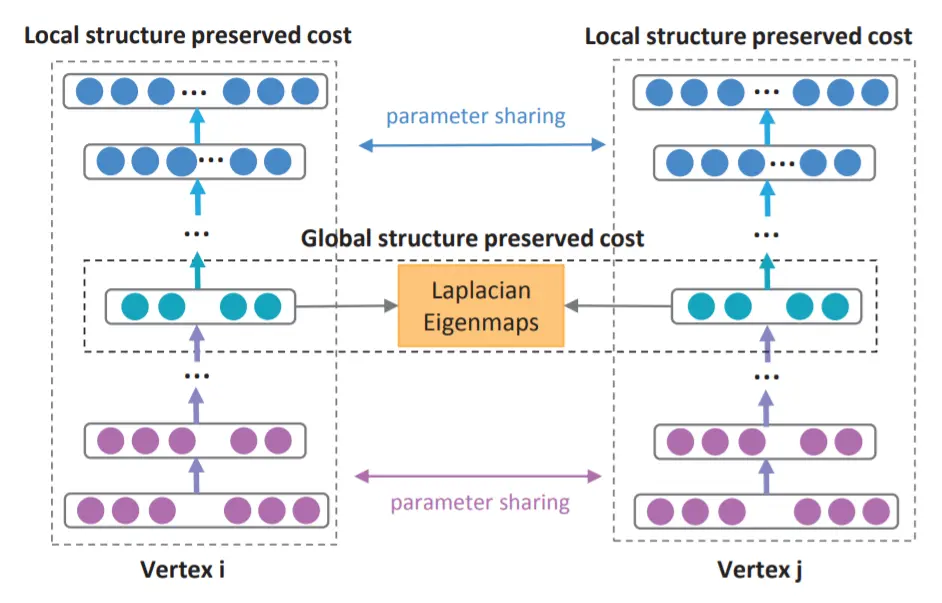 其中如果A(i, j)= 0则b[ij] = 1,否则bij = β > 1,β是另一个超参数。 SDNE 的整体架构如图 7 所示。