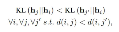 其中d(i, j)是从节点v[i]到v[j]的最短距离,KL[q(·) || p(·)]是q(·)和p(·)之间的 KL 散度 [89]。 换句话说,约束确保节点对之间的 KL 散度,具有与图距离相同的相对顺序。 但是,因为公式 42 难以优化,基于能量的损失 [90] 被用作松弛: