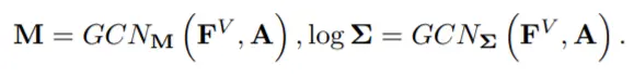 其中h[i]假设遵循高斯后验分布q (h[i]|M, Σ) = N (h[i]|M[i, :], diag (Σ[i, :]))。 对于均值和方差矩阵的编码器,作者采用 [36] 中的 GCN:
