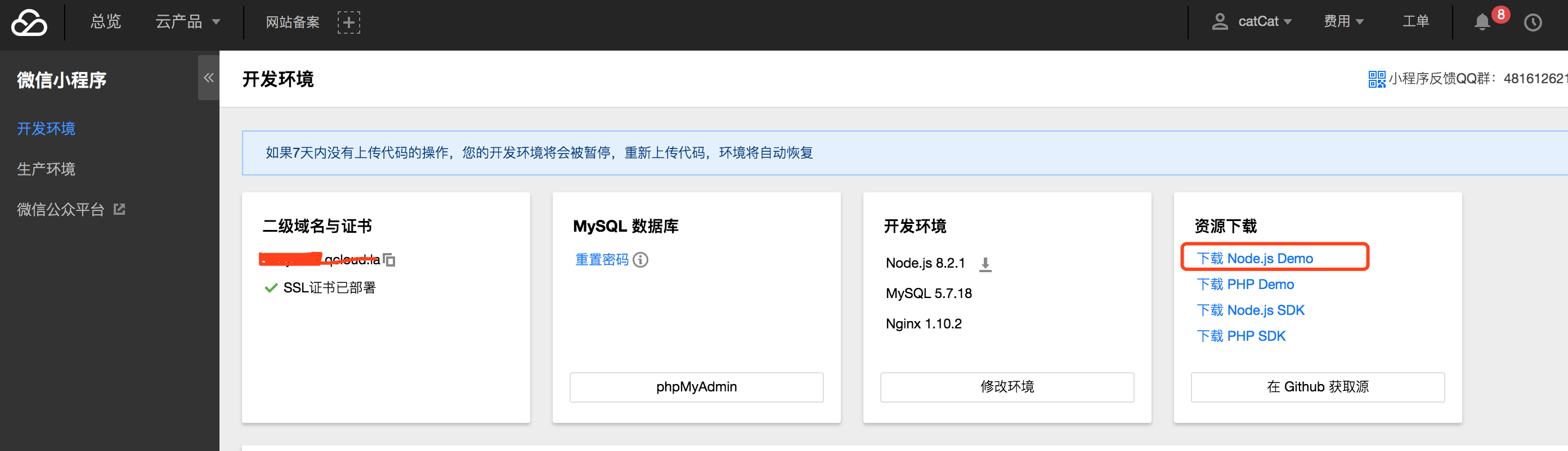 首先在微信小程序的开发环境的资源下载中下载node.js demo