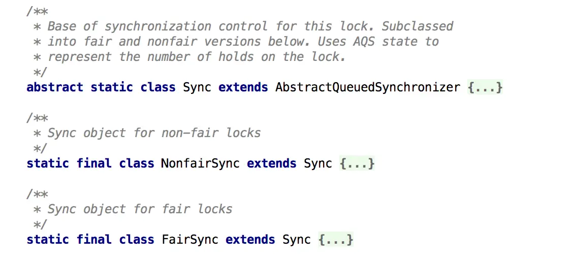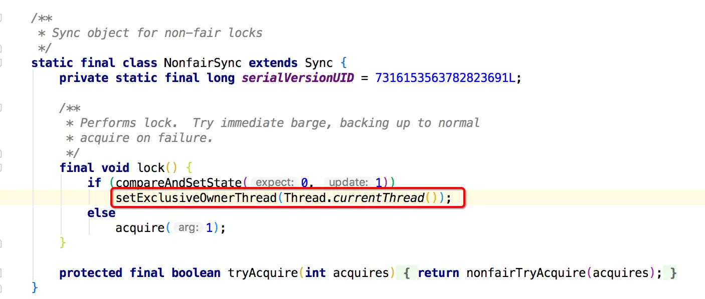 ReentrantLock的lock和unlock方法已经基本解析完毕了,唯独还剩下一个非公平锁 NonfairSync没说。其实,它和公平锁的唯一区别就是获取锁的方式不同,一个是按前后顺序一次获取锁,一个是抢占式的获取锁