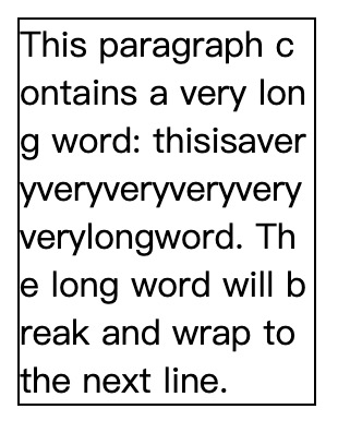 <p class="word-wrap">This paragraph contains a very long word: thisisaveryveryveryveryveryverylongword. The long word will break and wrap to the next line.</p>