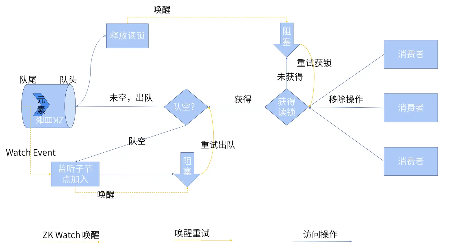 顺序节点的应用,类似于我们在用zookeeper实现分布式锁的时候如何去处理惊群效应的做法。 且根据队列的特点:FIFO(先进先出),入队时我们创建顺序节点(ps:为什么上面我们是用了顺序节点而不是说是临时顺序节点,是因为我们根本不考虑客户端挂掉的情况)并把元素传入队列,出队时我们取出最小的节点。使用watch机制来监听队列的状态,在队列满时进行阻塞,在队列空时进行写入即可。