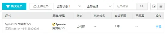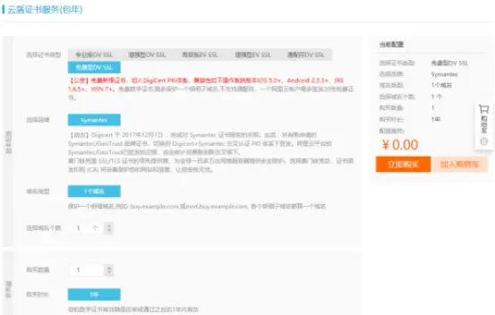 2、进入SSL证书页面,点击“购买证书”,选择免费1年的证书类型,点击“立即购买”