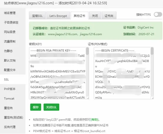 2、在弹出的窗口中,选择“SSL”,“其他证书”,将下载的证书解压成两个文件,分别粘贴到秘钥和证书两个输入框中,点击保存。此时证书已部署成功。