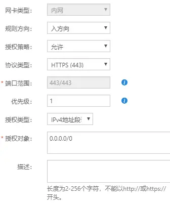 2、阿里云ECS控制台中,配置安全组入方向443端口