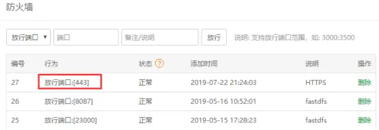 1、宝塔面板中,“安全”,在防火墙中放行443端口