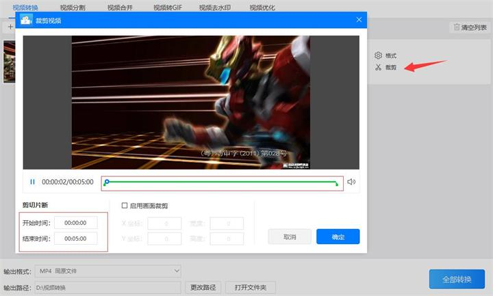 第二步:如果视频太长了不需要保存完整视频可以点击“裁剪”按钮,之后会跳出一个“裁剪视频”的界面,我们需要针对视频的‘开始时间’和‘结束时间’进行设置,也可以移动绿标来调整时间区间。