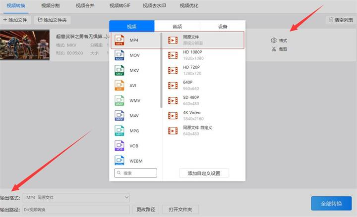 第三步:点击“格式”或“输出格式”按钮设置需要输出的格式。输出格式又分为输出视频格式和输出分辨率格式。由于我们要把mkv格式转换成mp4,所以把输出视频格式设置为‘mp4’格式,而输出分辨率尽量设置为和原文件相同的‘同原文件’格式。