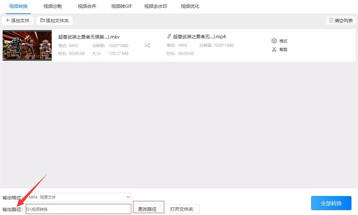 第四步:调整转换后的mp4的“输出路径”,调整时可以直接在输出路径右边的输入框中直接输入要输出的位置,也可以点击输入框右边的“更改路径”按钮选择需要输出的路径。两种设置的效果都一样,根据自己的习惯进行设置。