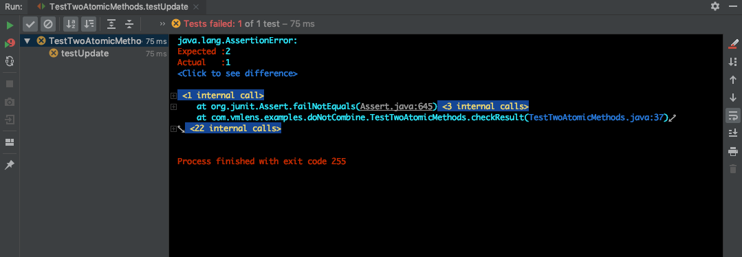图中可以看到在执行ConcurrentHashMap的原子操作get和put方法时候,出现了线程间的竞争,13和14线程分别先获取到了对象的锁,然后取得了map.get(1)的值,此时值为null,两个线程的取值都是null,剩下的就比较明了了。两个线程都进入了if-else判断的第一个条件语句中,又先后复制map.put(1,1),这样最终的结果map.get(1).intValue()就等于1,断言失败。