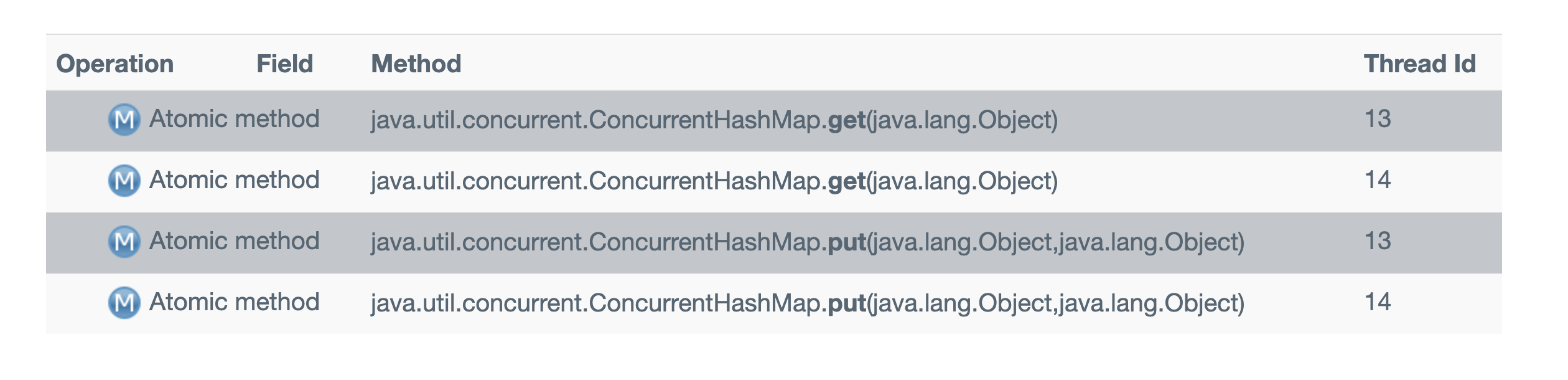 除了操作原子性之外,还有一个比较容易引起线程不安全的原因:安全方法组合。使用多个线程安全的方法组合成一个方法,也有可能导致线程不安全的情况出现。 以ConcurrentHashMap类为例,ConcurrentHashMap是一个高并发高性能的map实现类,他的每个方法都是线程安全的。 下面是示例代码: