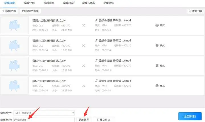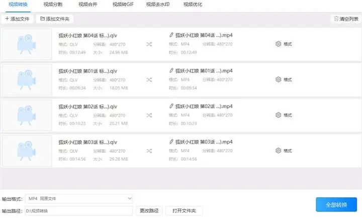 5、依次点击转换按钮转换或直接点击全部转换按钮把腾讯视频的qlv格式转换成mp4格式。在转换时会有一个蓝色进度条,在蓝色进度条达到100%后就表示软件已经把腾讯视频的qlv格式转换成mp4了。最后只需点击覆盖在“转换”按钮上的打开按钮或者直接打开之前预设的输出位置就可以找到转换成mp4的视频文件了。