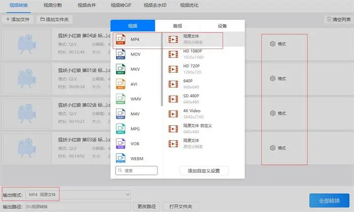 2、点击格式或输出格式按钮设置需要输出的格式,输出格式分为输出的视频格式和输出的视频分辨率。由于要把qlv格式转换成mp4格式,所以把输出的视频格式设置为‘mp4’格式,输出分辨率可以设置为和原视频相同分辨率的‘同原文件’格式。也可以根据自己的需求适量的降低分辨率。