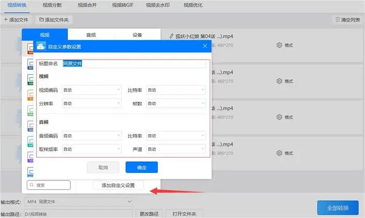 3、如果上述的‘mp4同原文件’格式或软件预设的其他参数不能满足需求,可以点击添加自定义设置按钮针对视频格式(视频编码、比特率、分辨率、帧数)或音频格式(音频编码、比特率、取样频率、声道)自定义设置。