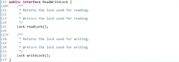 看下Java里的ReadWriteLock接口,它只规定了两个方法,一个返回读锁,一个返回写锁。