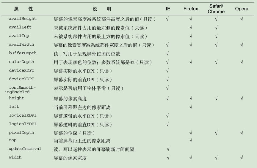 BOM 中还有两个对象: screen 和 history ,但它们的功能有限。 screen 对象中保存着与客户端 显示器有关的信息,这些信息一般只用于站点分析。 history 对象为访问浏览器的历史记录开了一个 小缝隙,开发人员可以据此判断历史记录的数量,也可以在历史记录中向后或向前导航到任意页面。