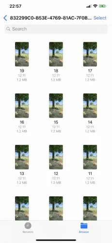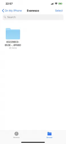 现在,构建并运行应用程序。 点击录制按钮,完成后,切换到Files应用。 在Evanesco文件夹下,您应该看到一个UUID命名的文件夹,其中包含20个项目。