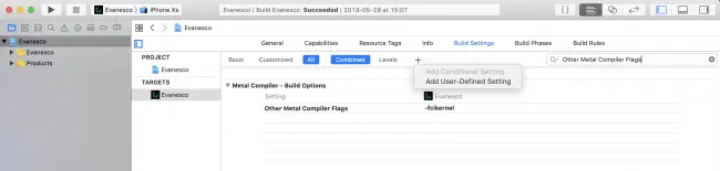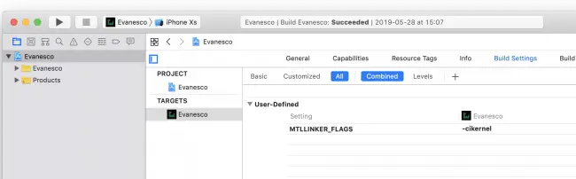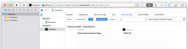 要编译和链接Metal文件,需要在Build Settings中添加两个标志。 所以前往那边。