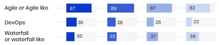 在这里我非常乐意跟大家分享一份来源于 QA Intelligence《State of Testing™ Report 2019》关于2016~2019年软件开发模式的调查数据: