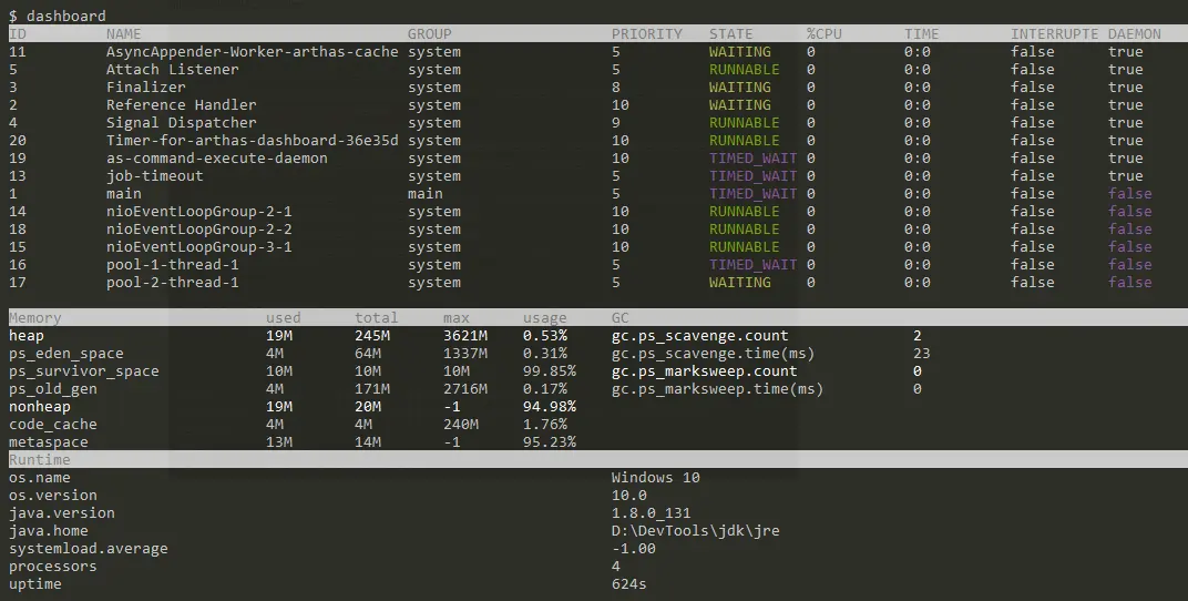 如果只是退出当前的连接,可以用quit或者exit命令。Attach到目标进程上的arthas还会继续运行,端口会保持开放,下次连接时可以直接连接上。